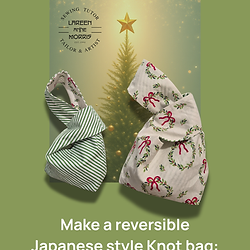 Create a reversible Japanese Style knot bag - learn how to bag out using the burrito method. During the workshop you will: Lay the pattern on the fabrics provided and cut out. Sew the knot bag using a burrito method to sew the handles. Sew boxed corners to create depth and volume to the bag. Hand stitch to close, using ladder stitch for a neat finish - making the bag reversible. You will be provided with enough fabric to make 1 knot bag - see photo for fabric provided for this workshop date. You are welcome to bring extra fabric to start a second bag - you will need 2 fat quarters. Please note: You will need to bring your own sewing machine and scissors to the workshop.